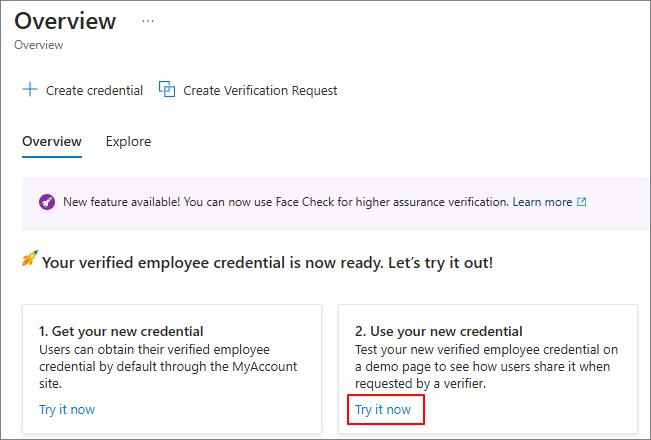2. Use your new credential -> Try it now를 클릭하면 Verified ID를 테스트 할 수 있는 페이지로 이동됩니다.