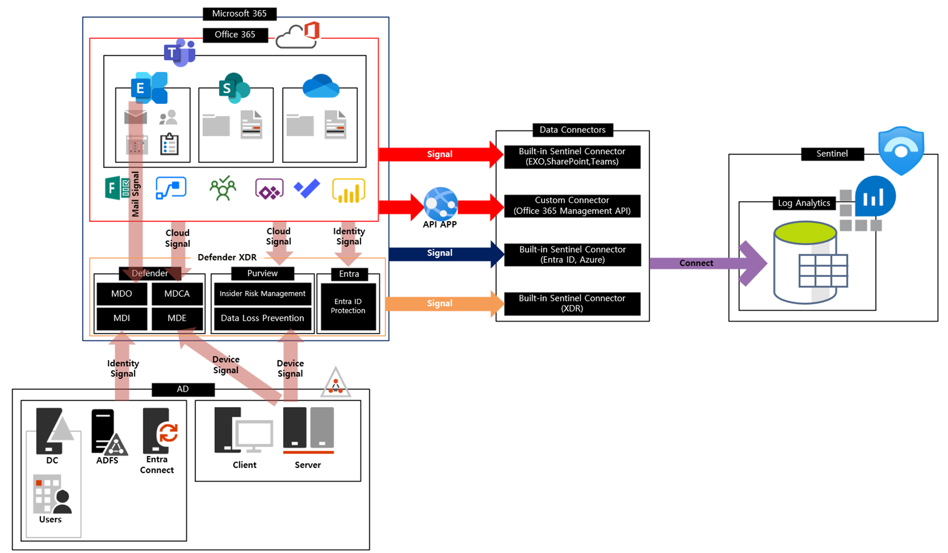 각 M365 영역에서 발생하는 시그널은 기본적으로 제공되는 Built-in 커넥터를 통해 Sentinel로 전달됩니다.