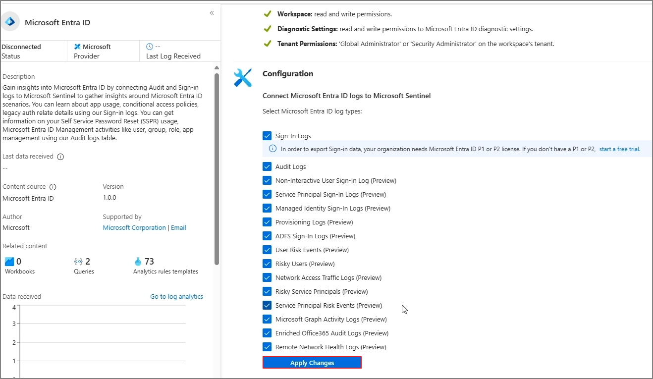 Data Connectors -> Microsoft Entra ID -> Open connector page