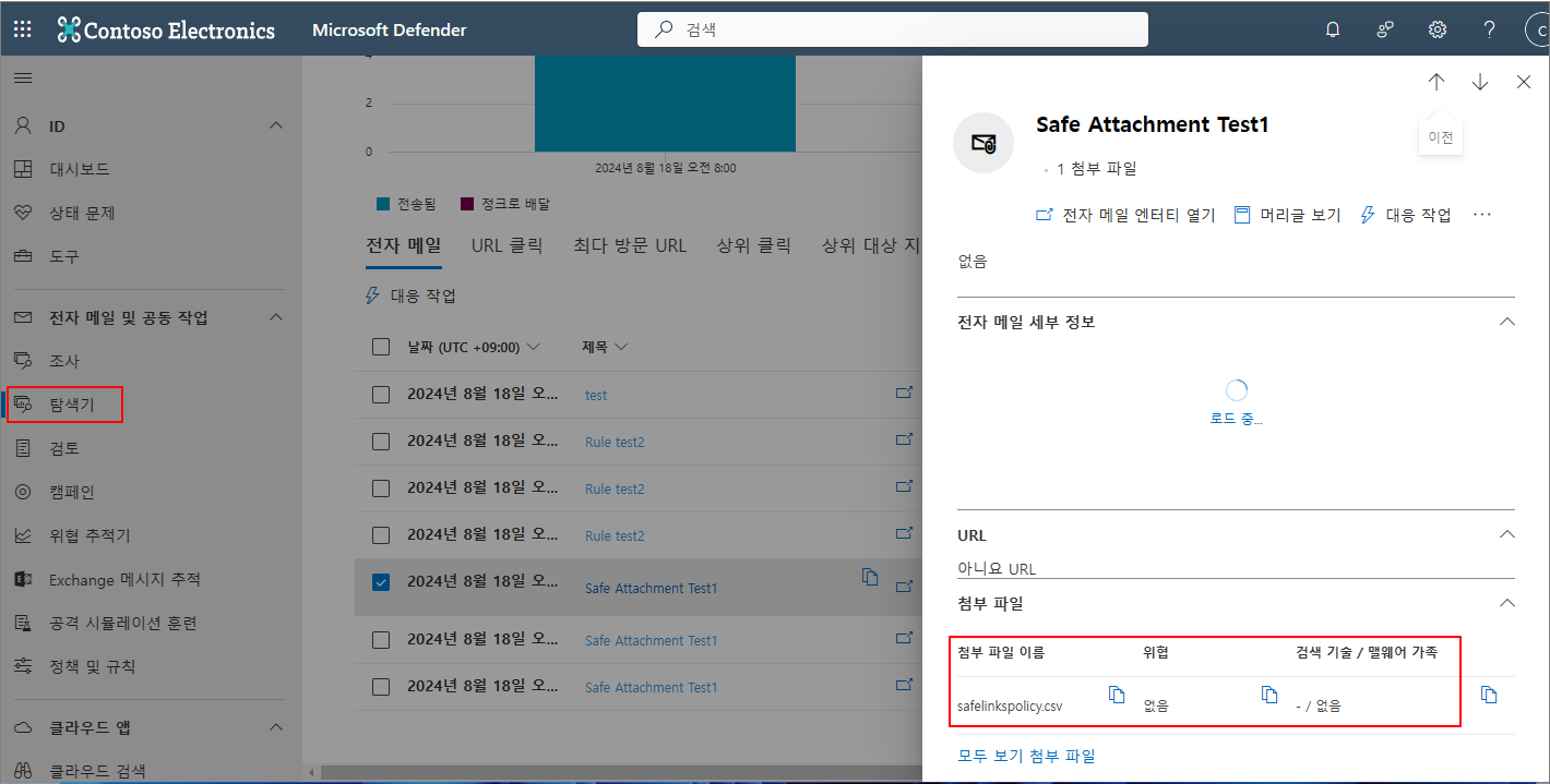 탐색기에서 각각의 메시지를 클릭해보면 첨부 파일을 확인할 있습니다. 다만 정책이 적용된 사용자와 아닌 사용자를 여기서 구분할 수는 없었습니다.