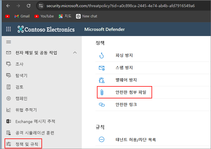Microsoft Defender -> 전자 메일 공동 작업 -> 정책 규칙 -> 안전한 첨부 파일