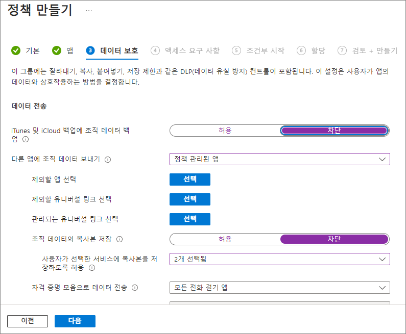 허용되는 최대 디바이스 위협 수준 -> 낮음 -> 액세스 차단 -> 다음