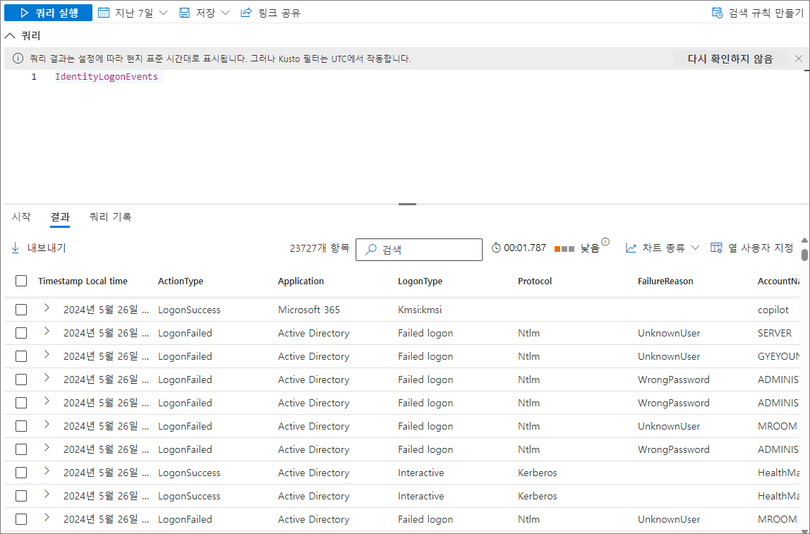 고급 헌팅 -> IdentityLogonEvents -> 쿼리 실행