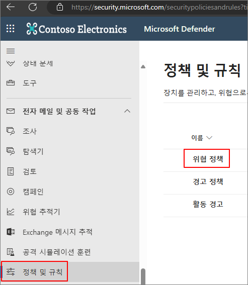 Microsoft Defender (https://security.microsoft.com) -> 전자 메일 및 공동 작업 -> 정책 및 규칙 -> 위협 정책