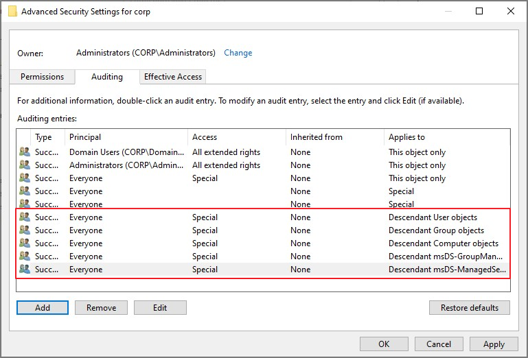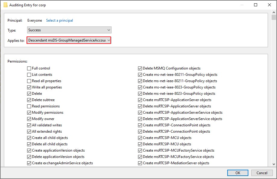 위에서 진행한 것과 같은 방식으로 Descendant Group object, Descendant Computer object, Descendant msDS-GroupManagedServiceAccount Objects, Descendant msDS-ManagedServiceAccount Objects 진행
