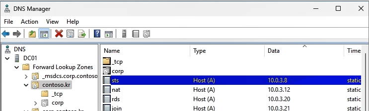 내부 DNS에서도 ADFS를 가리키는 주소의 IP를 변경해야 합니다.
