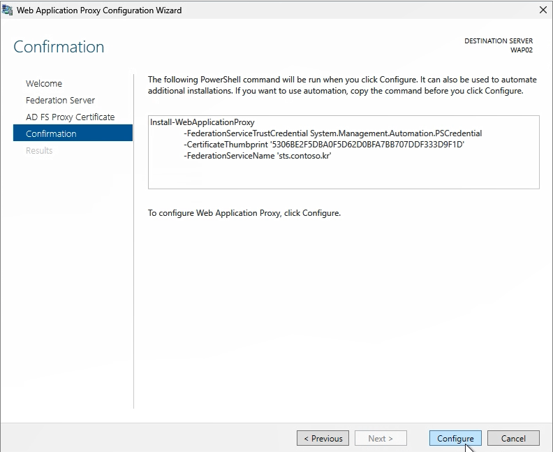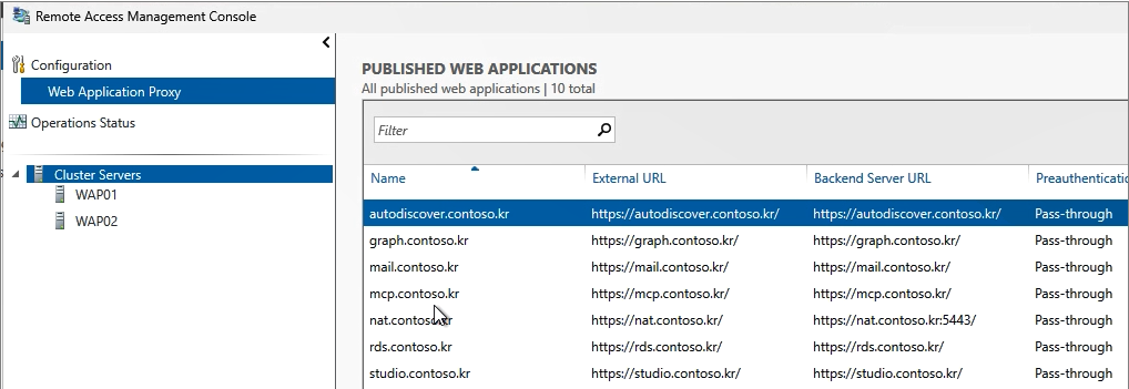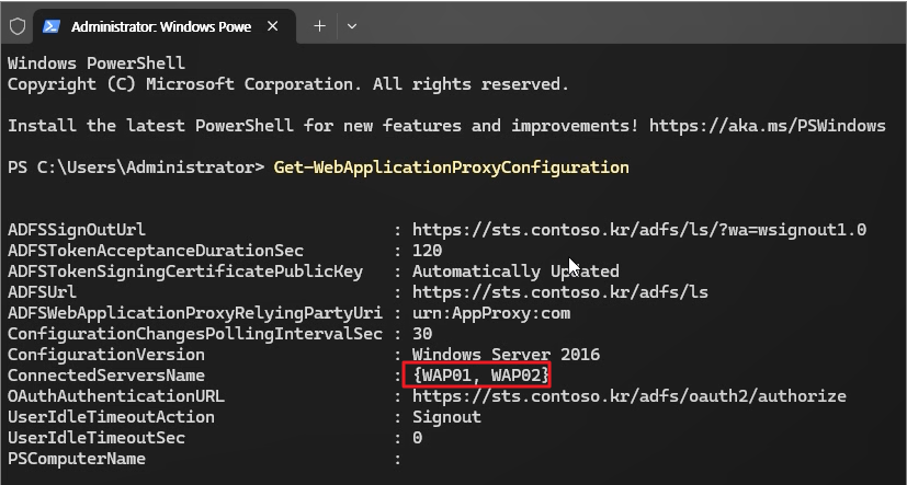 현재의 서버가 추가된 부분을 Get-WebApplicationProxyConfiguration을 통해서 확인할 수 있습니다.