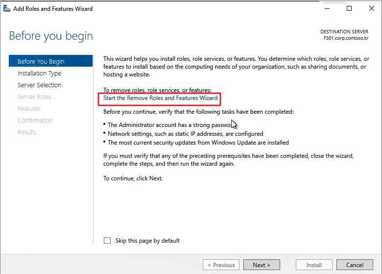 역할 설치 메뉴에서 Start the Remove Roles and Features Wizard