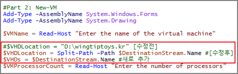 여기서 $VHDLocation = "D:\wingtiptoys.kr" 으로 연결하기 위해서는 $DestinationStream.Name 에서 폴더 경로만 표시해야 합니다.