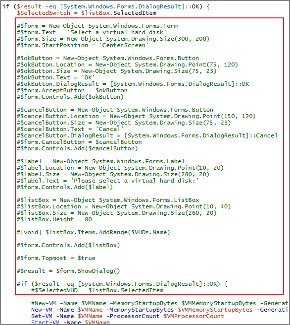 #New-VM -Name $VMName -MemoryStartupBytes $VMMemoryStartupBytes -Generation 2 -Path $VHDLocation -SwitchName $SelectedSwitch -VHDPath "$VHDLocation\$SelectedVHD"