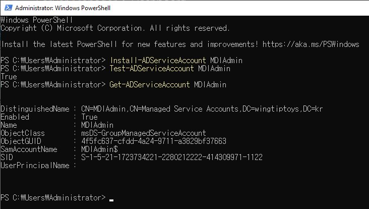 New-ADServiceAccount -Name MDIAdmin -DNSHostName “mdiadmin.wingtiptoys.kr” -PrincipalsAllowedToRetrieveManagedPassword MDIService