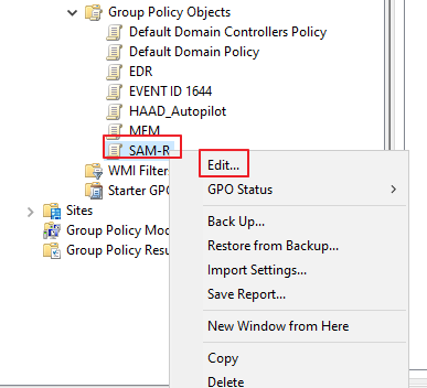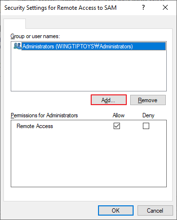 Computer Configuration -> Policies -> Windows Settings -> Security Settings -> Local Policies -> Security Options -> Network access – Restrict clients allowed to make remote calls to SAM