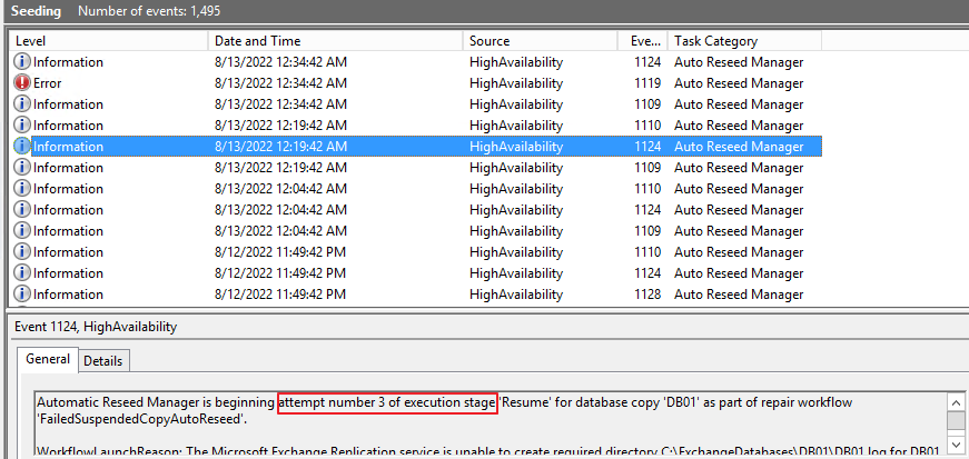 | Event ID 1119 Automatic Reseed Manager failed to resume database copy 'DB01' as part of repair workflow 'FailedSuspendedCopyAutoReseed' after a maximum of 3 attempts. The workflow will next attempt to assign a spare volume and reseed the database copy. 자동 Reseed Manager는 최대 3번의 시도 후에 복구 워크플로 'FailedSuspendedCopyAutoReseed'의 일부로 데이터베이스 복사본 'DB01'을 재개하지 못했습니다. 워크플로는 다음으로 예비 볼륨을 할당하고 데이터베이스 복사본을 다시 시드합니다. |