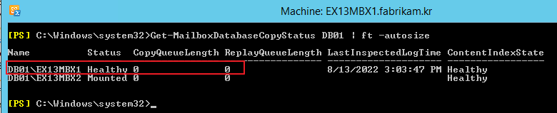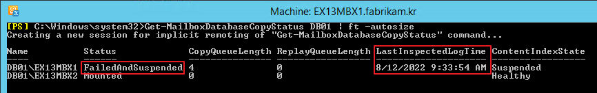 DB01\EX13MBX1 의 Status 가 FailedAndSuspended 인 것을 확인할 수 있습니다.