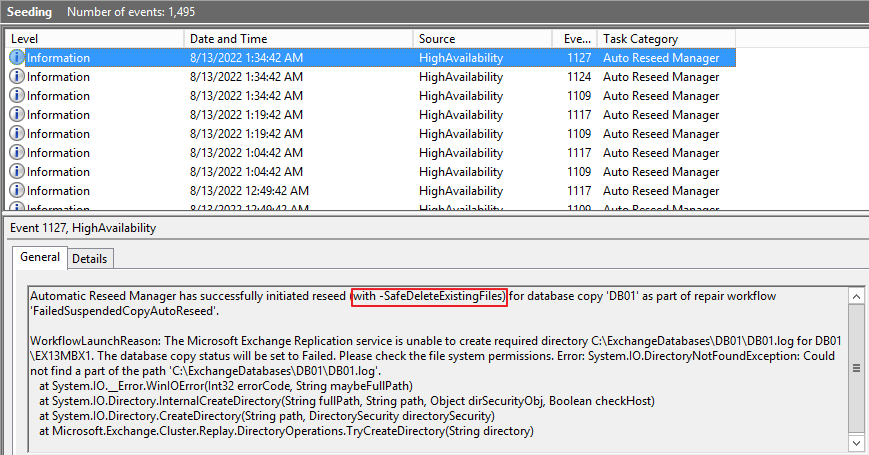 Event Viewer -> Applications and Services Logs -> Microsoft -> Exchange -> HighAvailability -> Seeding 으로 이동합니다.