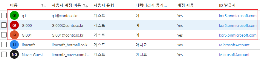 adatum.kr도 contoso.kr 과 마찬가지로 M365를 사용하는 조직이며, 아래의 사용자를 라이선스가 할당되어 있습니다.