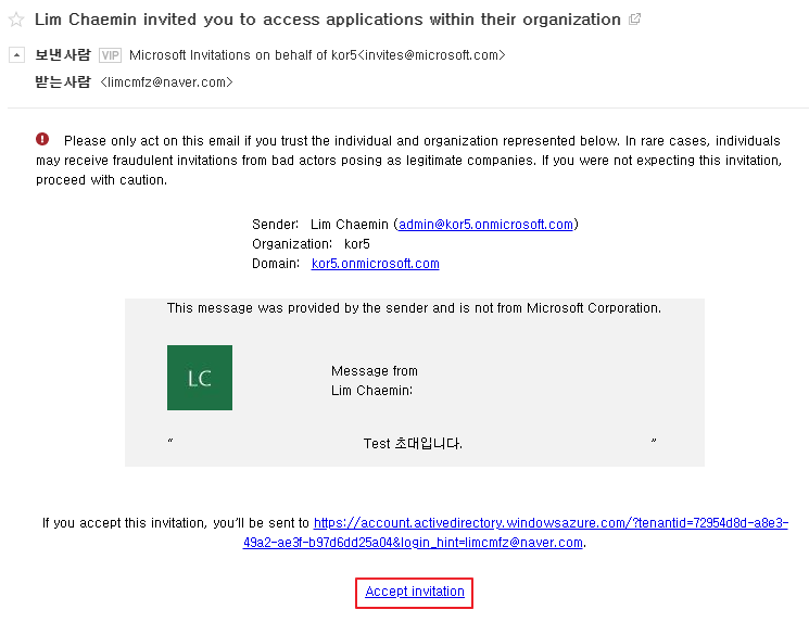 그리고는 아래와 같이 #EXT#@Tenantname.onmicrosoft.com 형태로 Azure AD에 계정이 생성됩니다.