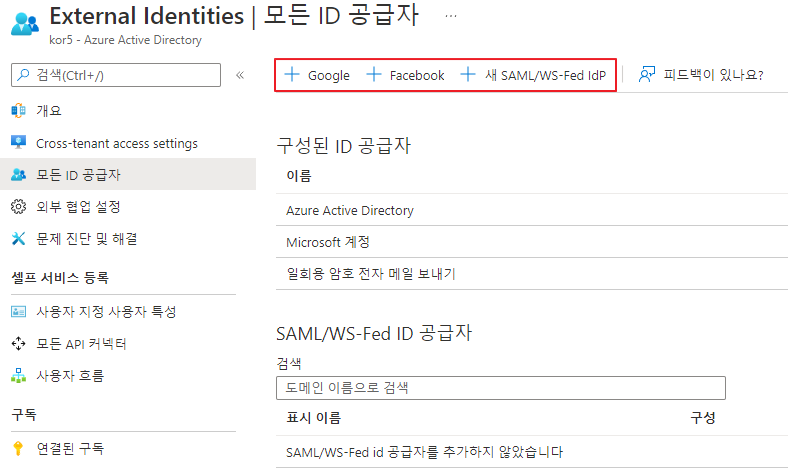 Azure Portal -> Azure Active Directory -> External Identites -> 모든 ID 공급자 메뉴로 이동합니다.