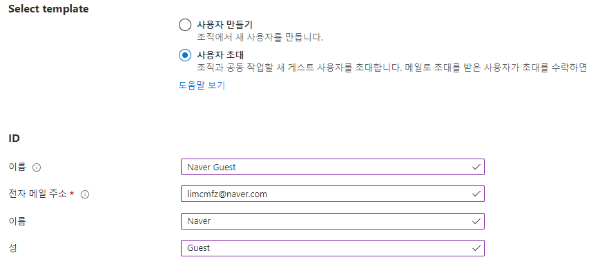 Azure Portal -> Azure Active Directory -> 새 게스트 사용자를 클릭합니다.