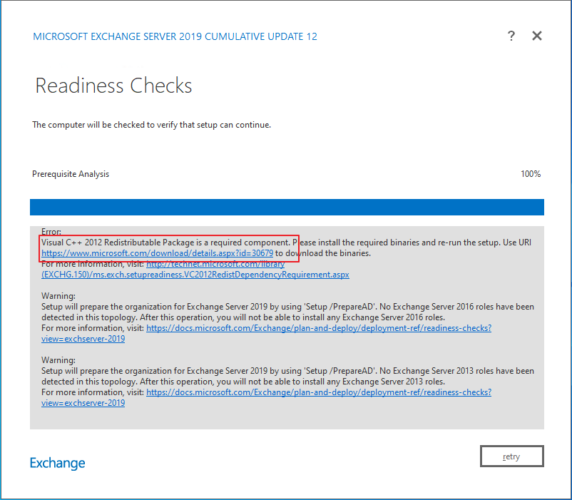 아래와 같이 경고 메시지가 발생합니다. Visual C++ 2012 재배포 도구를 설치합니다. -> Retry