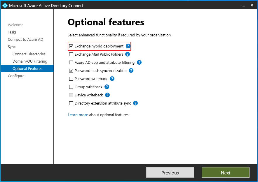 Exchange hybrid deployment 옵션이 활성화 되는 것을 확인할 수 있습니다. -> Next