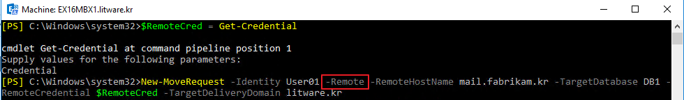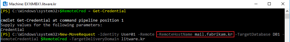 New-MoveRequest -Identity User01 -Remote -RemoteHostName mail.fabrikam.kr -TargetDatabase DB1 -