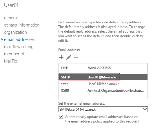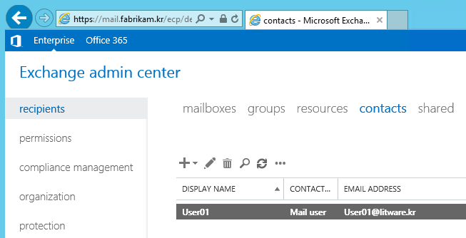 Fabrikam.kr 에서는 User01이 Mailbox -> Mail User로 변경되었습니다.