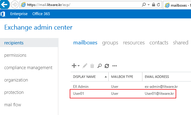 Litware.kr 에서 확인하면 Mail User -> Mailbox 로 변경되었습니다.