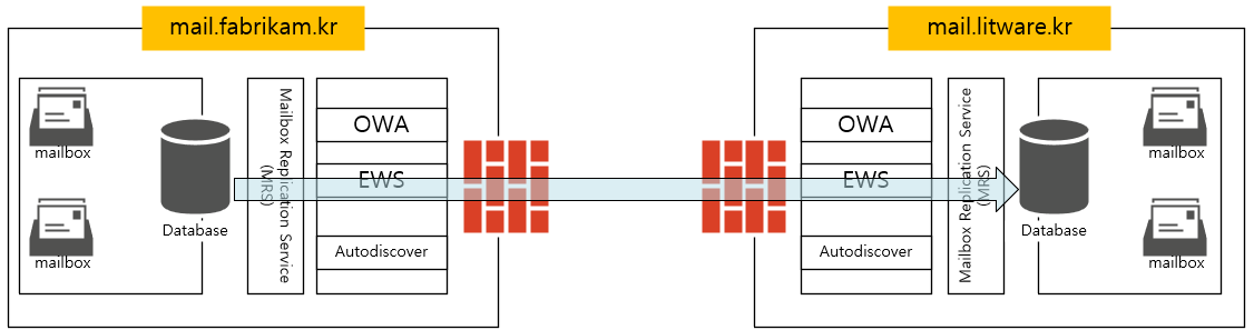 Migration 은 DB -> EWS -> 방화벽(mail.fabrikam.kr) -> 방화벽(mail.litware.kr) -> EWS -> DB 의 구조로 진행됩니다.