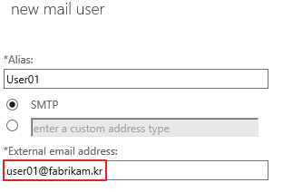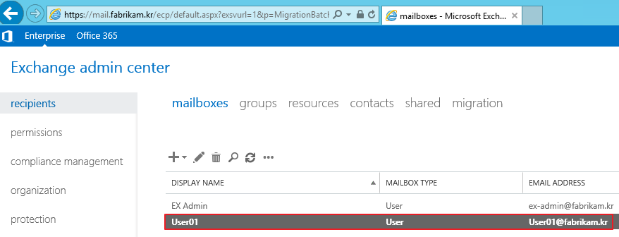 Fabrikam.kr 에서는 User01이 Mailbox -> Mail User로 변경되었습니다.