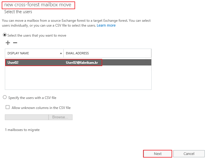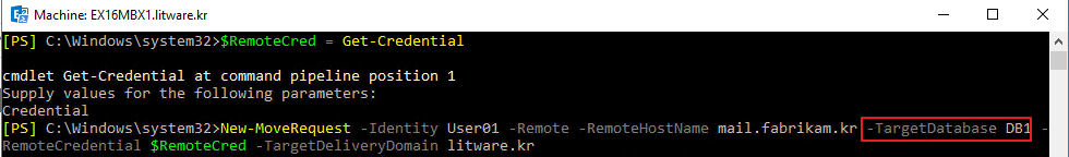 New-MoveRequest -Identity User01 -Remote -RemoteHostName mail.fabrikam.kr -TargetDatabase DB1 -
