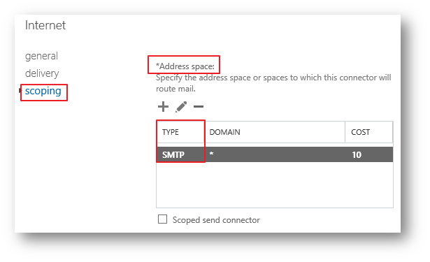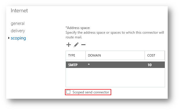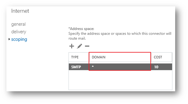 | The address spaces defines the destination domains or other address spaces that are serviced by the connector. When Exchange selects a connector for routing a message, it only considers connectors that have a matching address space. If more than one connector matches the destination address space, the connector with the more precise address match is selected. For example, suppose the recipient is julia@marketing.contoso.com, and separate Send connectors are configured for *, *.contoso.com and marketing.contoso.com. The order of connector preference based solely on the address space is: 1: marketing.contoso.com 2: *.contoso.com 3: * 주소 공간은 커넥터에서 서비스하는 대상 도메인 또는 기타 주소 공간을 정의합니다. Exchange는 메시지 라우팅을 위해 커넥터를 선택할 때 일치하는 주소 공간이 있는 커넥터만 고려합니다. 둘 이상의 커넥터가 대상 주소 공간과 일치하는 경우 주소 일치가 더 정확한 커넥터가 선택됩니다. 예를 들어 받는 사람이 julia@marketing.contoso.com이고 *, *.contoso.com 및 marketing.contoso.com에 대해 별도의 송신 커넥터가 구성되어 있다고 가정합니다. 주소 공간만을 기반으로 하는 커넥터 기본 설정의 순서는 다음과 같습니다. 1: marketing.contoso.com 2: *.contoso.com 3: * |