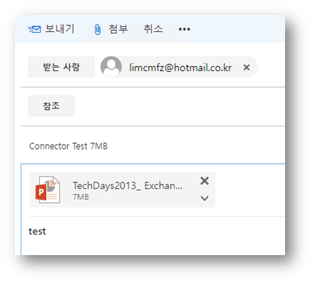 확인을 위해서 A,B커넥터를 생성한 뒤, 모든 설정은 동일하지만 A 커넥터의 메시지 사이즈 제한은 5MB, B 커넥터는 35MB로 설정 한 뒤, 5MB를 초과하는 메일을 발송해 보았습니다.