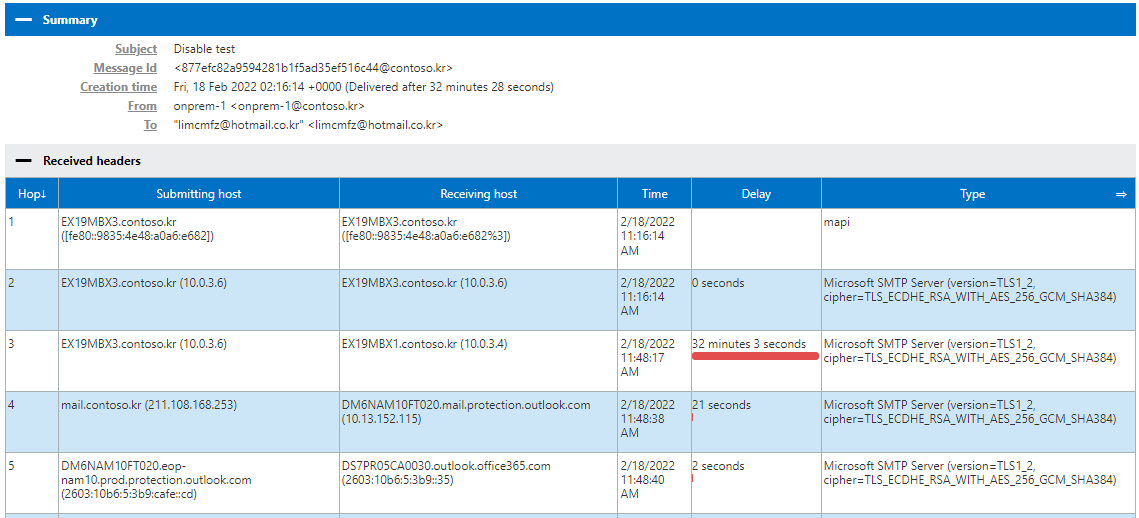 그리고 Enable 하면 다시 발송된 것을 확인할 수 있으며, 해더를 보면 어느 단계에서 지연되었다는 것을 대략 확인할 수 있습니다.