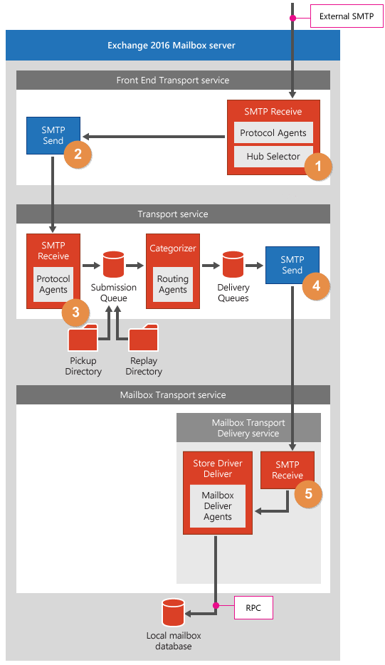 | The Mailbox Transport service consists of two separate services: the Mailbox Transport Submission service and Mailbox Transport Delivery service. The Mailbox Transport Delivery service receives SMTP messages from the Transport service, and connects to the local mailbox database by using RPC to deliver the message. The Mailbox Transport Submission service connects to the local mailbox database by using RPC to retrieve messages, and submits the messages over SMTP to the Transport service. The Mailbox Transport service is stateless, and doesn't use message delivery queues. Mailbox Transport service는 Mailbox Transport Submission service와 Mailbox Transport Delivery service의 두 가지 개별 서비스로 구성됩니다. Mailbox Transport Delivery service는 Transport service에서 SMTP 메시지를 수신하고 RPC를 사용하여 로컬 사서함 데이터베이스에 연결하여 메시지를 배달합니다. Mailbox Transport Submission service는 RPC를 사용하여 메시지를 검색하여 로컬 사서함 데이터베이스에 연결하고 SMTP를 통해 전송 서비스에 메시지를 전송합니다. Mailbox Transport service는 상태 비저장이며 메시지 배달 큐를 사용하지 않습니다. |