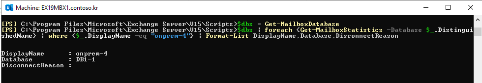 $dbs | foreach {Get-MailboxStatistics -Database $_.DistinguishedName} | where {$_.DisplayName -eq "onprem-4"} | Format-List DisplayName,Database,DisconnectReason