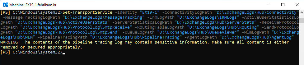| Set-TransportService -Identity "EX19-1" -ConnectivityLogPath "D:\ExchangeLogs\Hub\Connectivity" -MessageTrackingLogPath "D:\ExchangeLogs\MessageTracking" -IrmLogPath "D:\ExchangeLogs\IRMLogs" -ActiveUserStatisticsLogPath "D:\ExchangeLogs\Hub\ActiveUsersStats" -ServerStatisticsLogPath "D:\ExchangeLogs\Hub\ServerStats" -ReceiveProtocolLogPath "D:\ExchangeLogs\Hub\ProtocolLog\SmtpReceive" -RoutingTableLogPath "D:\ExchangeLogs\Hub\Routing" -SendProtocolLogPath "D:\ExchangeLogs\Hub\ProtocolLog\SmtpSend" -QueueLogPath "D:\ExchangeLogs\Hub\QueueViewer" -WlmLogPath "D:\ExchangeLogs\Hub\WLM" -PipelineTracingPath "D:\ExchangeLogs\Hub\PipelineTracing" -AgentLogPath "D:\ExchangeLogs\Hub\AgentLog" |