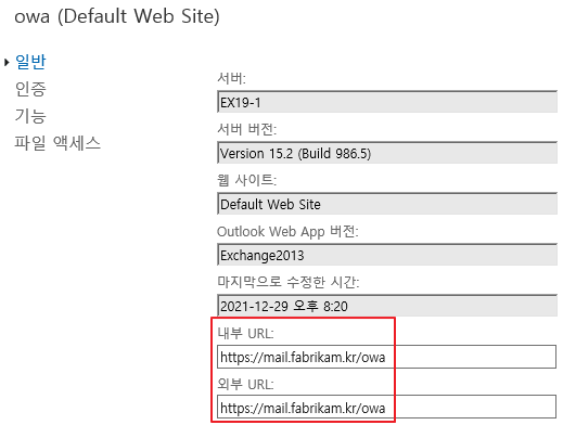 Set-MapiVirtualDirectory -Identity "<서버>\mapi (Default Web Site)" -InternalUrl "https://mail.fabrikam.kr/mapi" -ExternalUrl "https://mail.fabrikam.kr/mapi"
