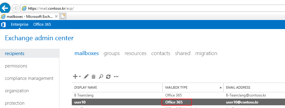On-Premise 사서함은 Azure AD 상에서 메일 사용자라는 연락처 개체 형태로 등록됩니다. 그리고 마이그레이션이 완료되면, On-premise 에서는 Office 365 로 변경됩니다. 대략 마이그레이션 전과 후는 아래의 그림과 같습니다.