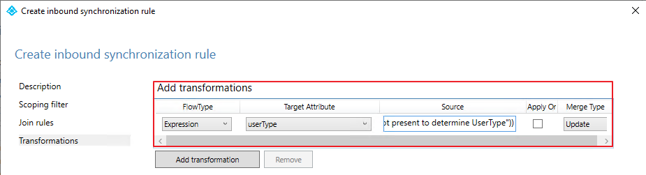 | IIF(IsPresent([userPrincipalName]),IIF(CBool(InStr(LCase([userPrincipalName]),"onprem-")=0),"Member","Guest"),Error("UserPrincipalName is not present to determine UserType")) |