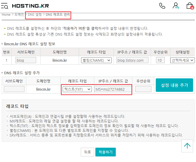 만약 네임서버가 별도로 없다면, 도메인 구매한 사이트에서 DNS 설정메뉴에서 추가할 수 있습니다.