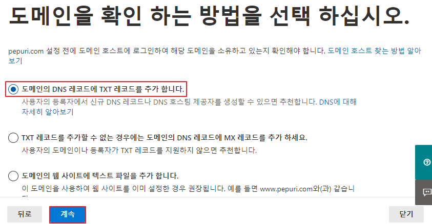 각각의 안내된 레코드 등록절차를 진행합니다. (단 Exchange Hybrid 환경은 일부 레코드 등록절차가 다릅니다.)