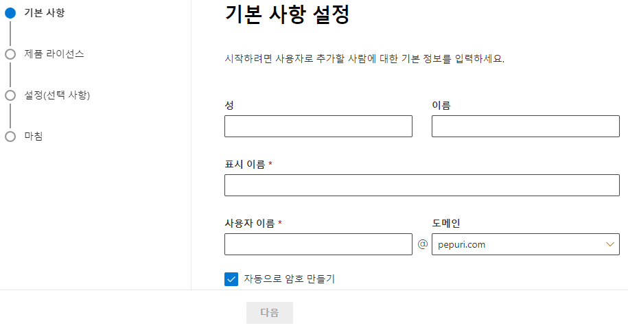 주의 사항으로는 1개의 관리자 계정은 반드시 onmicrosoft.com 의 주소를 보유해야 합니다.