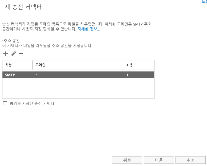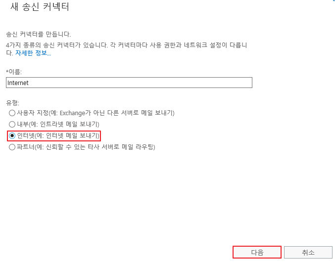 ECP 사이트 - 메일 흐름 - 송신 커넥터 - 새로 만들기