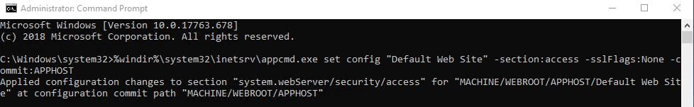%windir%\system32\inetsrv\appcmd.exe set config "Default Web Site" -section:access -sslFlags:None -commit:APPHOST