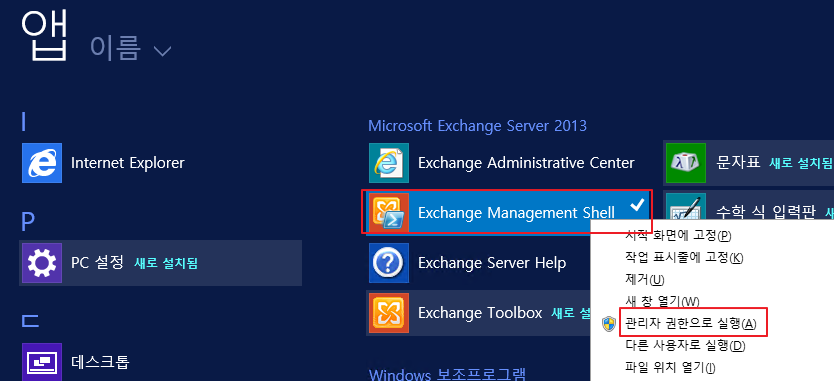 Exchange Management Shell 을 관리자 권한으로 실행합니다.