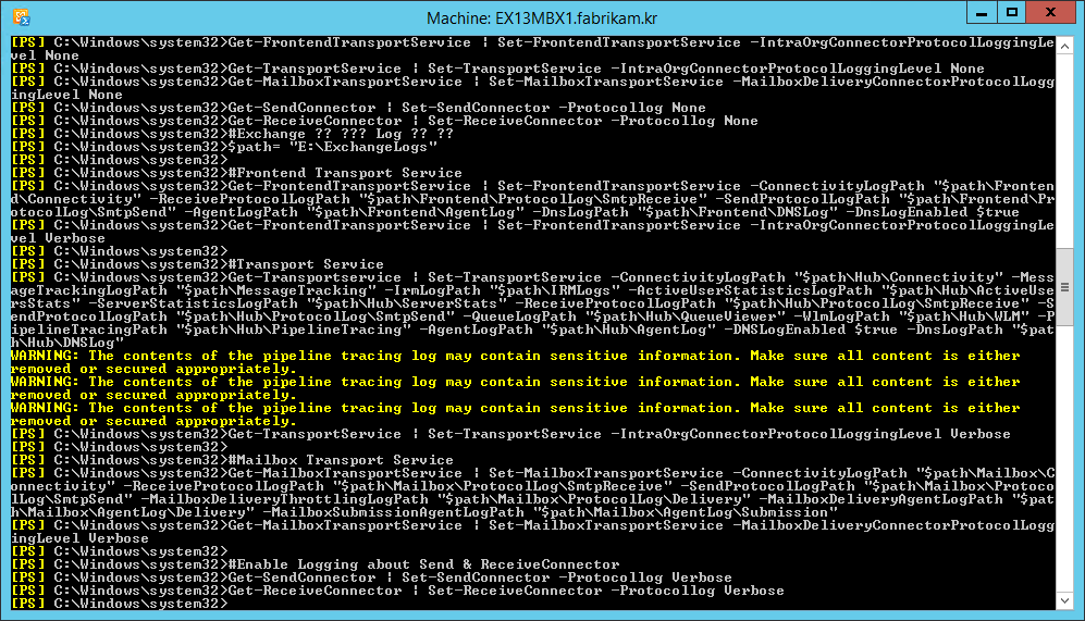 Get-FrontendTransportService | Set-FrontendTransportService -ConnectivityLogPath "$path\Frontend\Connectivity" -ReceiveProtocolLogPath "$path\Frontend\ProtocolLog\SmtpReceive" -SendProtocolLogPath "$path\Frontend\ProtocolLog\SmtpSend" -AgentLogPath "$path\Frontend\AgentLog" -DnsLogPath "$path\Frontend\DNSLog" -DnsLogEnabled $true