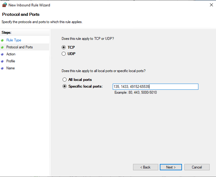 Enable firewall rules for inbound RPC Communications - Check - Next
