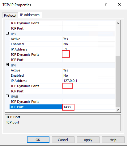 Dynamic ports 를 전부 제거- IPAll 의 TCP Port를 1433 으로 지정합니다.