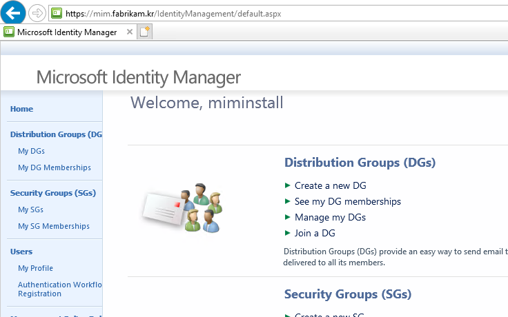 http://mim.fabrikam.kr/IdentityManagement URL 접속 (아래의 스크린샷은 SSL 인증서를 바인딩하였기 때문에 https 입니다.)